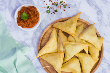 Gefrituurde driehoek traditioneel gevuld met aardappelen, ui, erwten, koriander en kikkererwten. Verkrijgbaar in de varianten kip/vega. Ontdek meer >